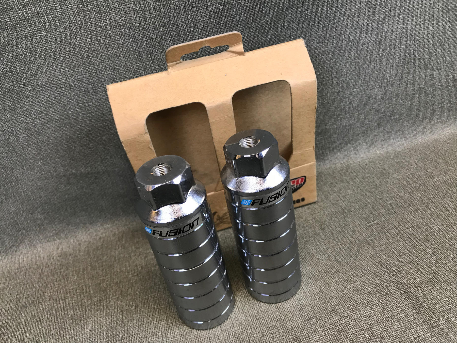 There’s three versions of the Mega 4″: Mega 4″ with studs for 3/8′ alxe, Mega 4″ Grooved with studs for 3/8′ alxes, and Mega 4″ Grooved threaded 26 TPI. The Fusion Mega 4” is really 4 1/4”. I’ll have a gallery for all three versions down below. Both the front and the rear pegs do not differ from one another except on some bikes I noticed that one set never has the studs in them out of the four.