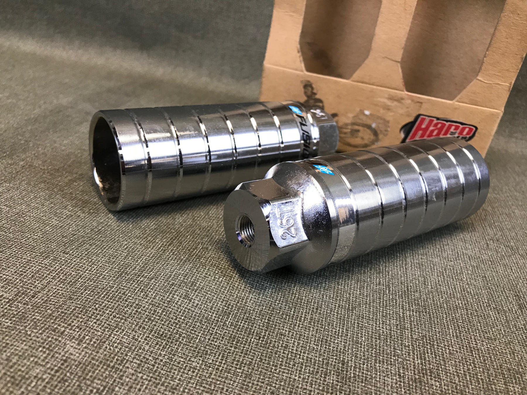 The Mega 4″ with studs for 3/8′ alxe and Mega 4″ Grooved with studs for 3/8′ alxes are pretty much the same peg the only difference is that one is grooved and the other is smooth. As always all these parts were most likely made in the Taiwan factory where the Haro frames were constructed.