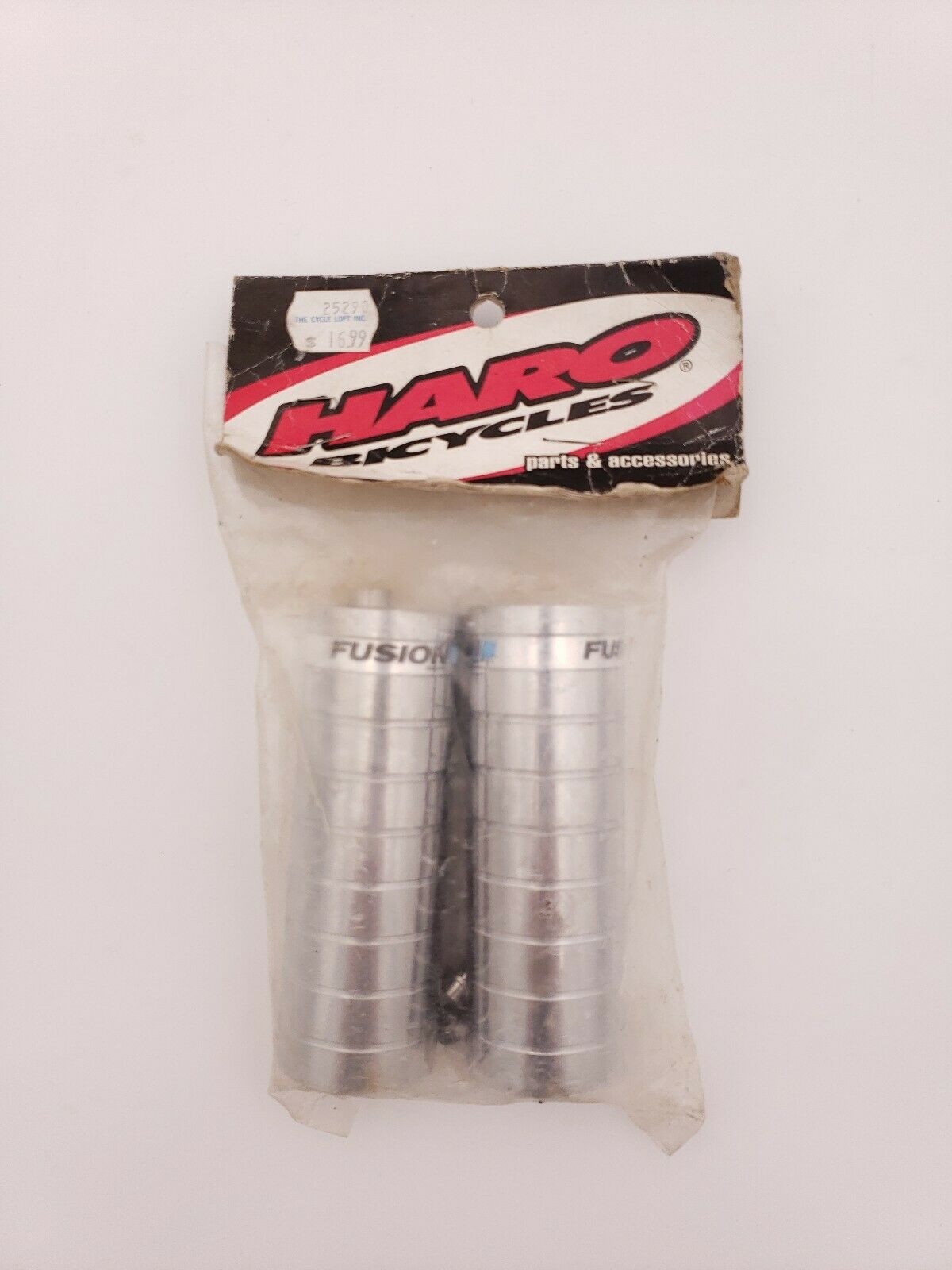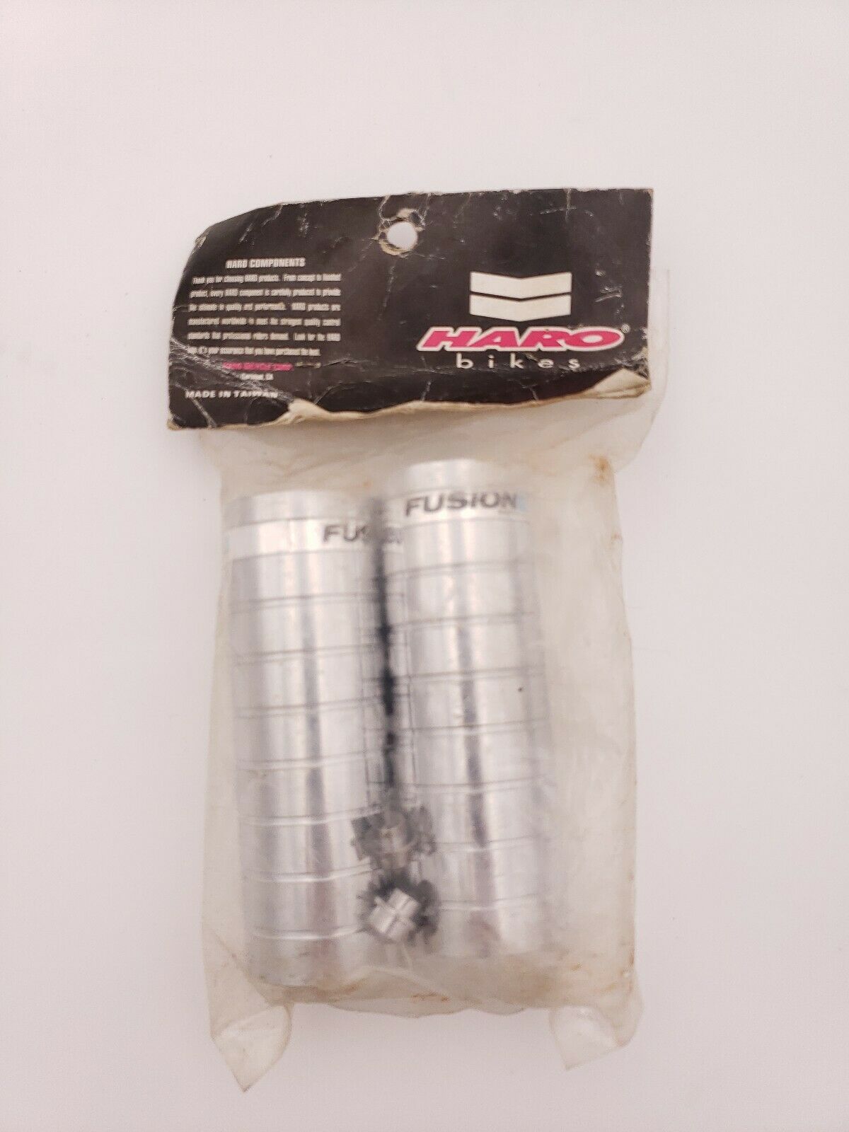 Haro Fusion Mega 4″ pegs were released some time in the late 1990s. This was the first shot at an anti-slip system on the pegs which was a screw (also known as a stud) that screwed into the top of the peg. (To keep your peg from rotating while grinding and loosening the wheel.) The later Haro Fusion Mega 4″ Spider Pegs which had a four-cross insert design. I believe they were geared towards street, vert, and park riders.