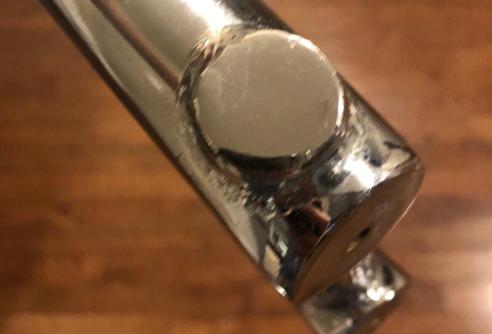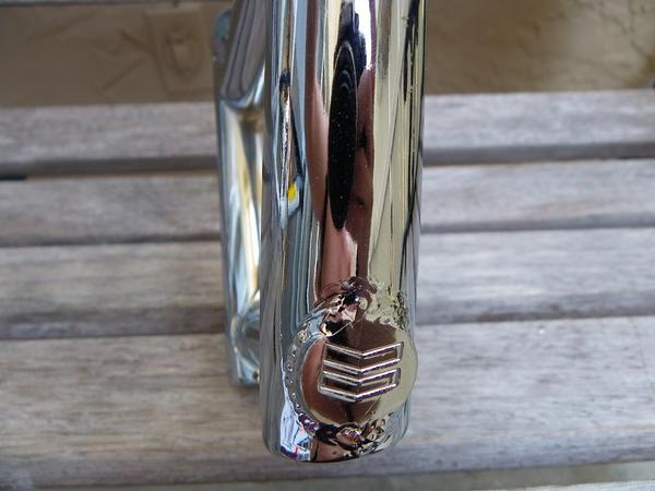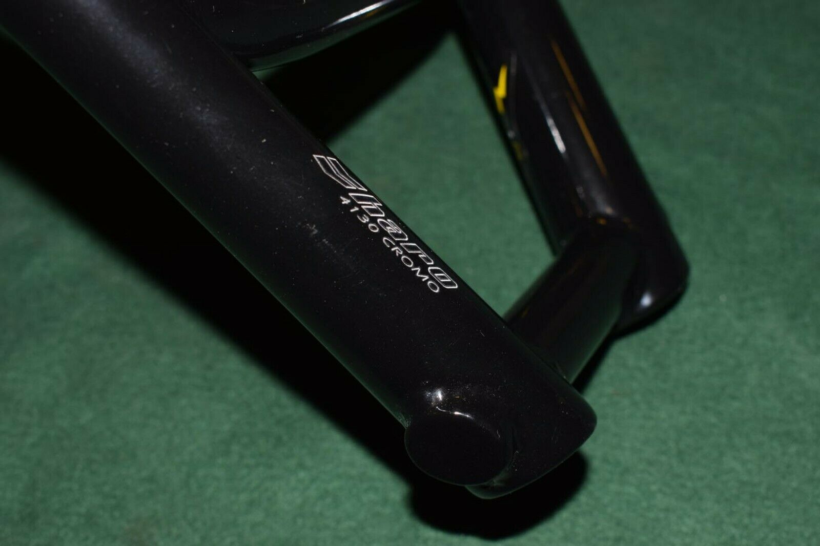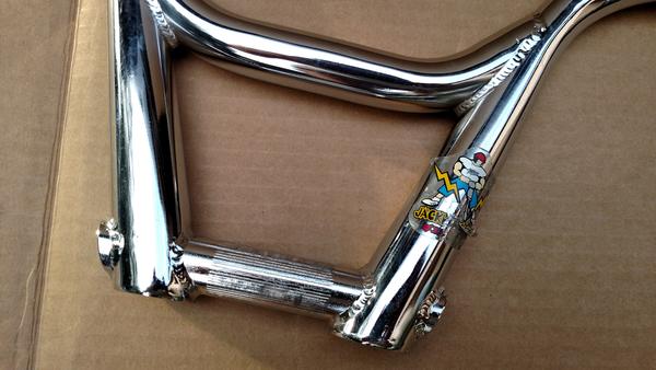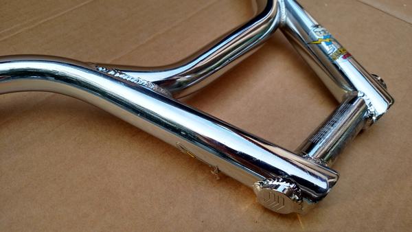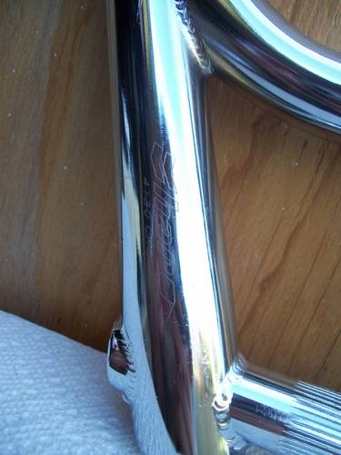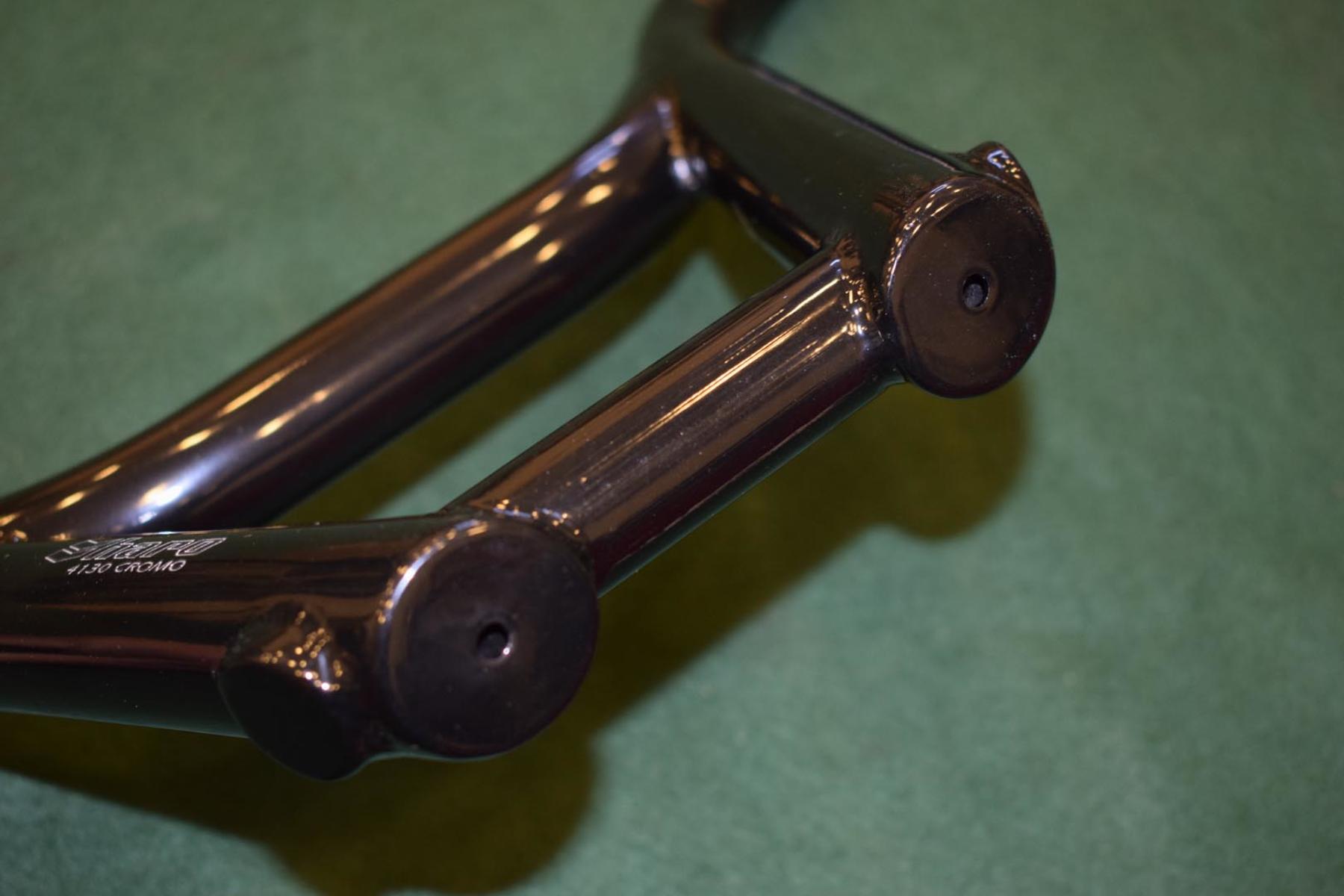 These bars had no knurling on the crossbar. The end caps were open, but the bottom of the bars had weeping holes; one on each side. The bottom bar on each end has the Haro chevrons stamped (not all bars have them) and they had a sticker on the right front side of the bars. On the left side you’ll see 4130 CRMO stamped (not all of the bars I’ve seen had the stamp but they still are).